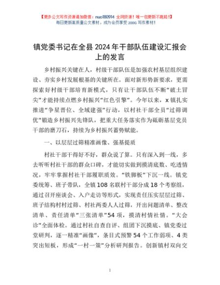 / 镇党委书记在全县2024年干部队伍建设汇报会上的发言