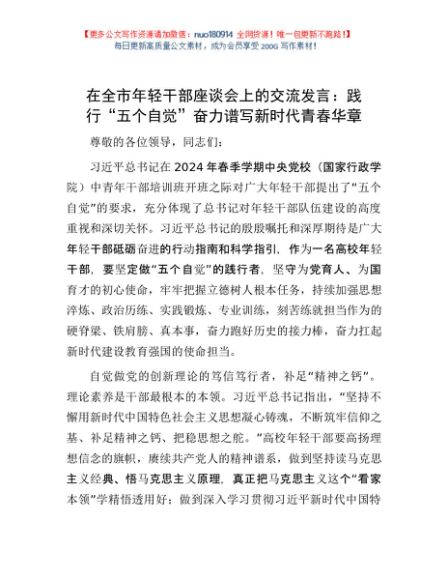 / 在全市年轻干部座谈会上的交流发言:践行“五个自觉” 奋力谱写新时代青春华章