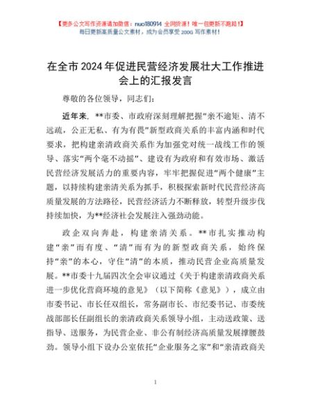 / 在全市2024年促进民营经济发展壮大工作推进会上的汇报发言