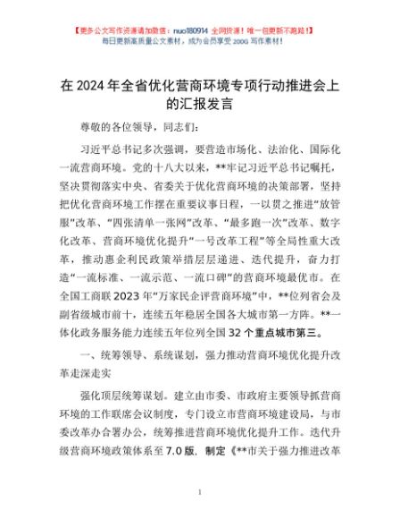 / 在2024年全省优化营商环境专项行动推进会上的汇报发言