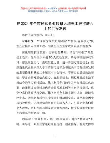 / 在2024年全市民营企业接班人培养工程推进会上的汇报发言