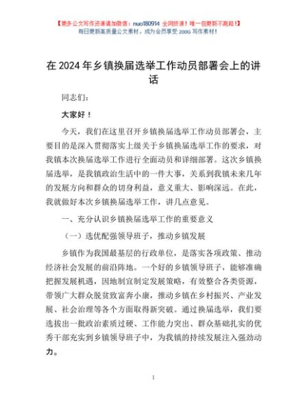 / 在2024年乡镇换届选举工作动员部署会上的讲话