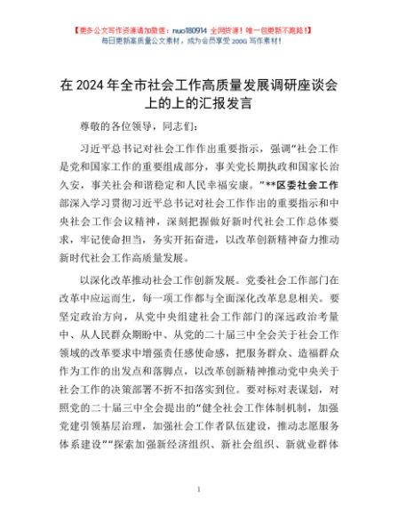 / 在2024年全市社会工作高质量发展调研座谈会上的上的汇报发言