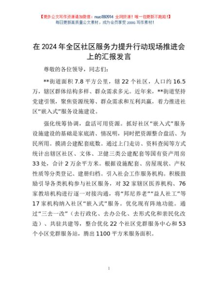 / 在2024年全区社区服务力提升行动现场推进会上的汇报发言