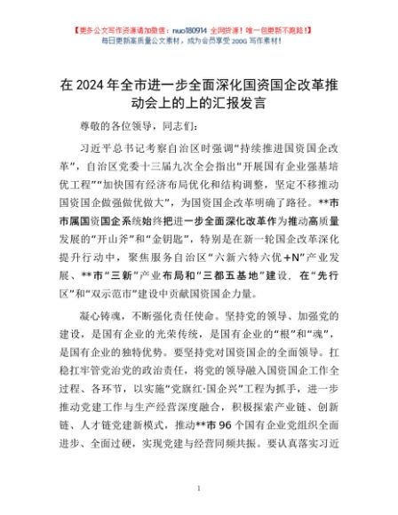 / 在2024年全市进一步全面深化国资国企改革推动会上的上的汇报发言