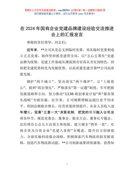 / 在2024年国有企业党建品牌建设经验交流推进会上的汇报发言