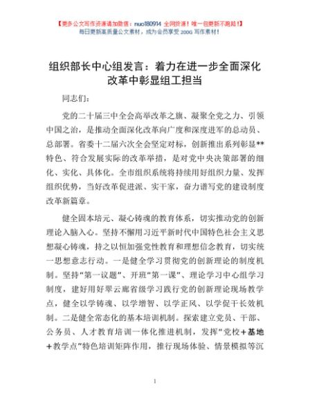 组织部长中心组发言:着力在进一步全面深化改革中彰显组工担当