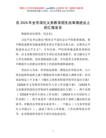 / 在2024年全市深化义务教育招生改革推进会上的汇报发言