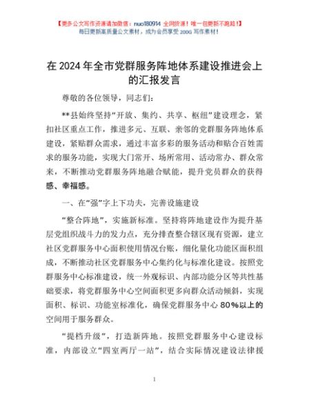 / 在2024年全市党群服务阵地体系建设推进会上的汇报发言
