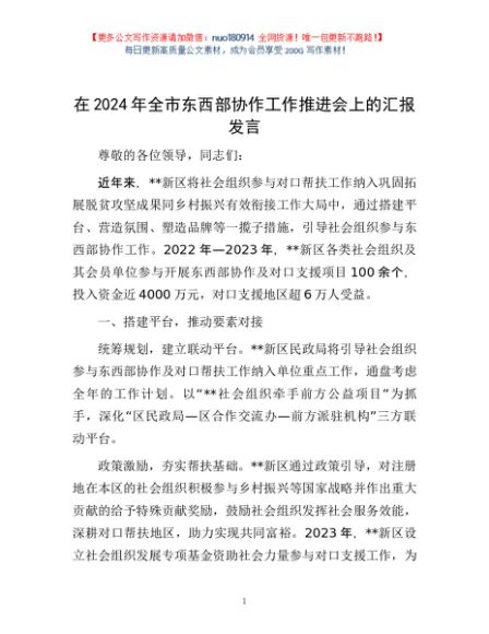/ 在2024年全市东西部协作工作推进会上的汇报发言