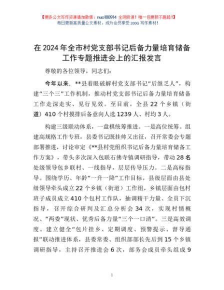 / 在2024年全市村党支部书记后备力量培育储备工作专题推进会上的汇报发言