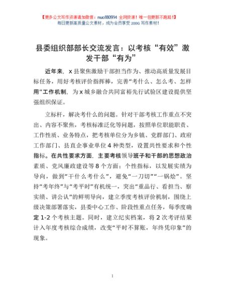 / 县委组织部部长交流发言:以考核“有效”激发干部“有为”