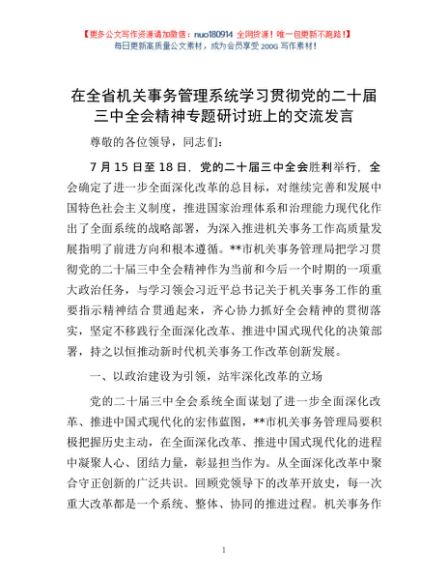 / 在全省机关事务管理系统学习贯彻党的二十届三中全会精神专题研讨班上的交流发言