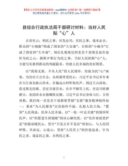 / 县综合行政执法局干部研讨材料:当好人民贴“心”人