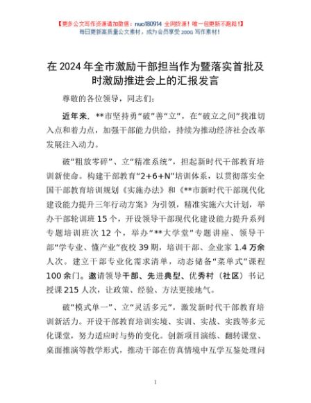 / 在2024年全市激励干部担当作为暨落实首批及时激励推进会上的汇报发言