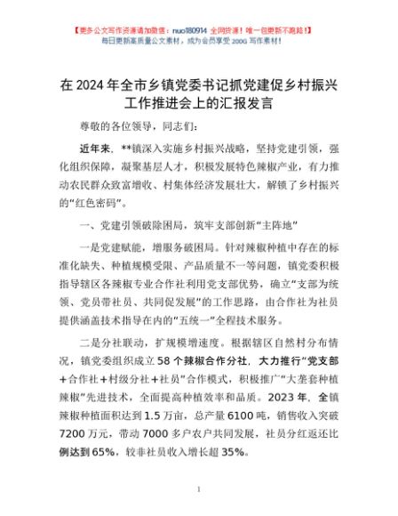 / 在2024年全市乡镇党委书记抓党建促乡村振兴工作推进会上的汇报发言