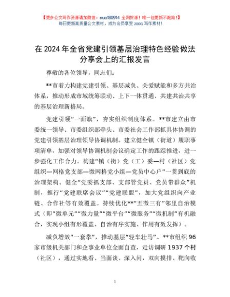 / 在2024年全省党建引领基层治理特色经验做法分享会上的汇报发言