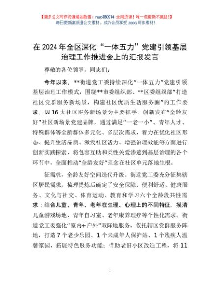 / 在2024年全区深化“一体五力”党建引领基层治理工作推进会上的汇报发言