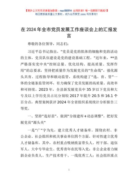 / 在2024年全市党员发展工作座谈会上的汇报发言