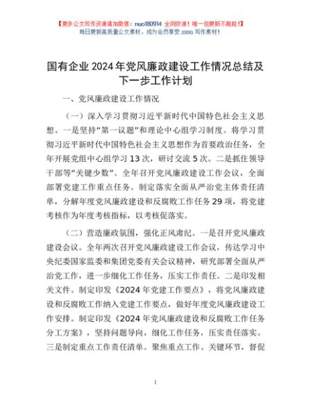 / 国有企业2024年党风廉政建设工作情况总结及下一步工作计划
