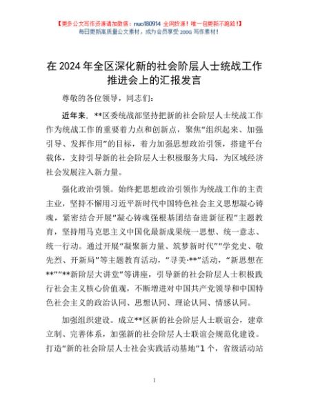 / 在2024年全区深化新的社会阶层人士统战工作推进会上的汇报发言