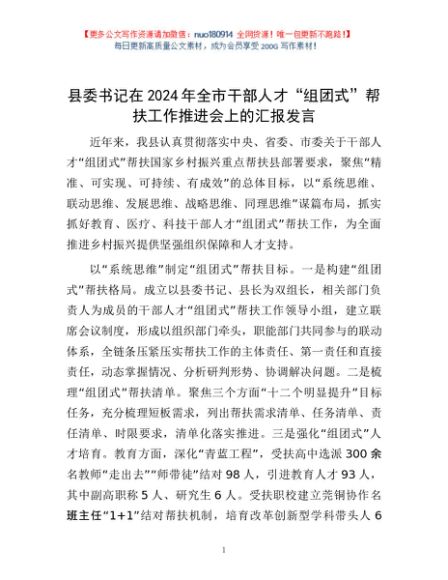 / 县委书记在2024年全市干部人才“组团式”帮扶工作推进会上的汇报发言