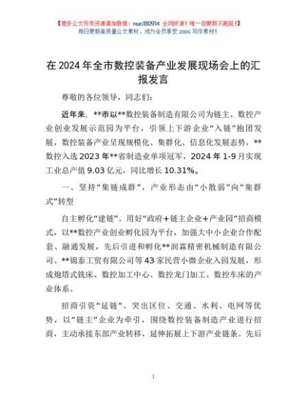 / 在2024年全市数控装备产业发展现场会上的汇报发言
