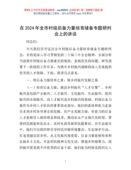/ 在2024年全市村级后备力量培育储备专题研判会上的讲话