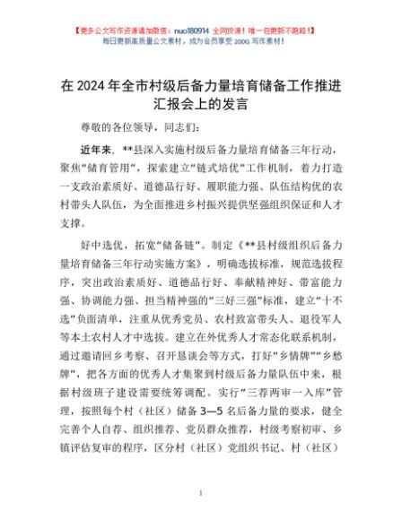 / 在2024年全市村级后备力量培育储备工作推进汇报会上的发言