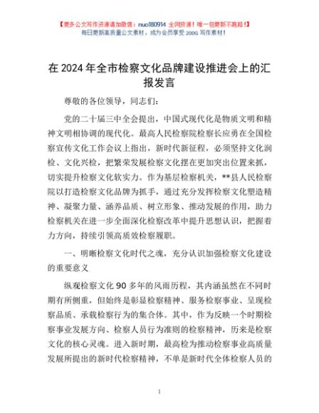 / 在2024年全市检察文化品牌建设推进会上的汇报发言
