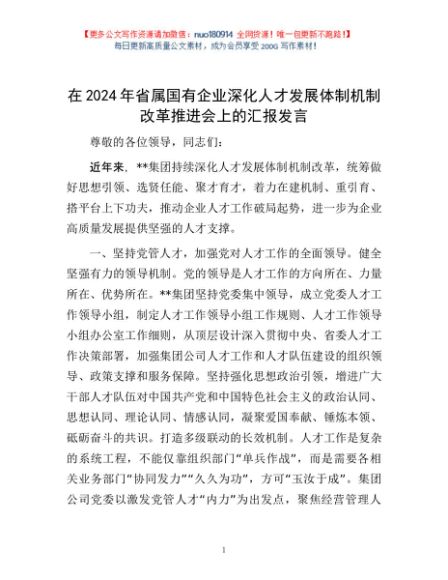 / 在2024年省属国有企业深化人才发展体制机制改革推进会上的汇报发言
