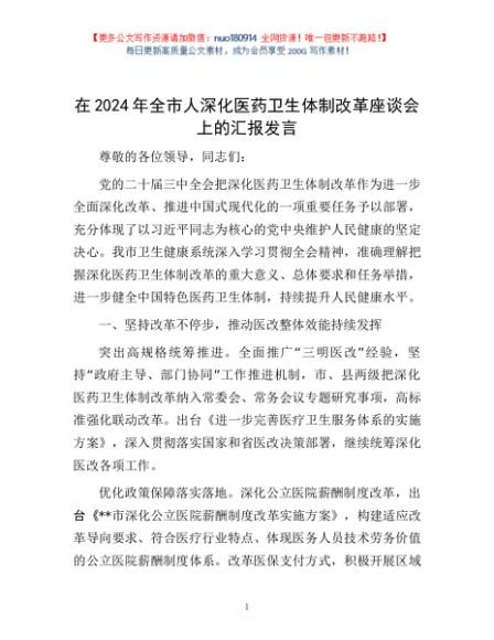 / 在2024年全市人深化医药卫生体制改革座谈会上的汇报发言