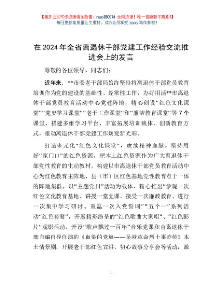 / 在2024年全省离退休干部党建工作经验交流推进会上的发言