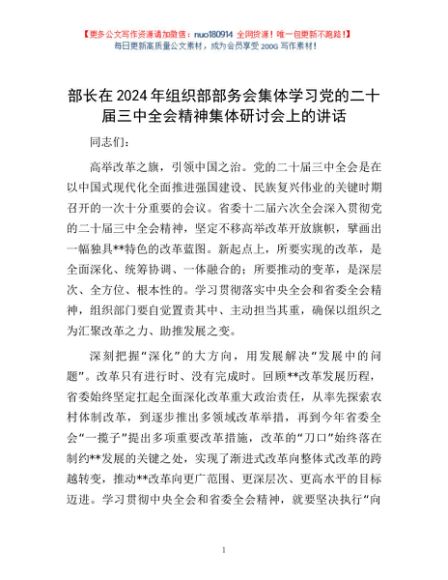 / 部长在2024年组织部部务会集体学习党的二十届三中全会精神集体研讨会上的讲话