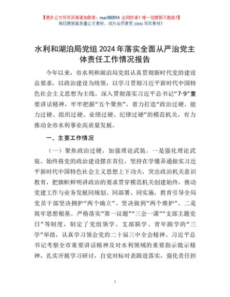 / 水利和湖泊局党组2024年落实全面从严治党主体责任工作情况报告