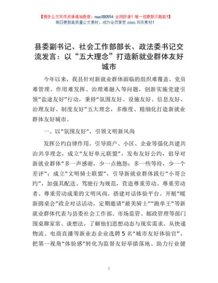 / 县委副书记、社会工作部部长、政法委书记交流发言:以“五大理念”打造新就业群体友好城市