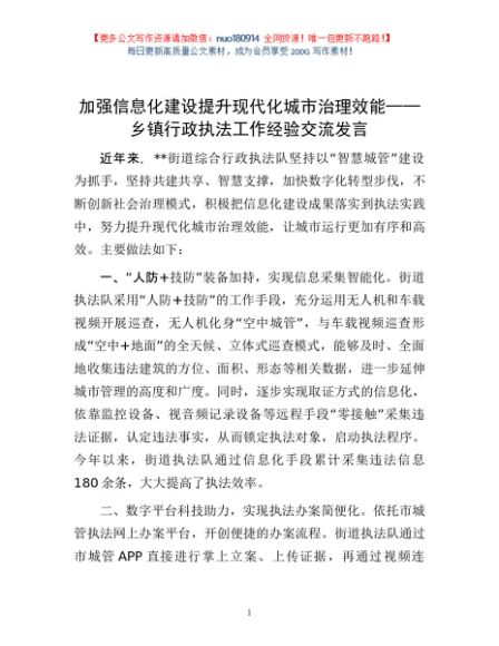 / 加强信息化建设 提升现代化城市治理效能——乡镇行政执法工作经验交流发言