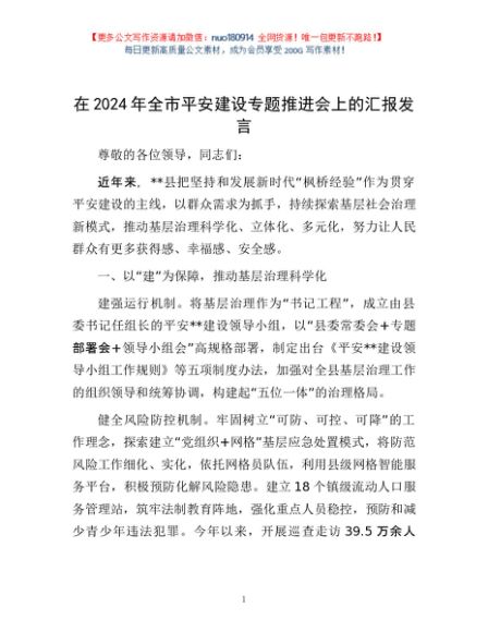 / 在2024年全市平安建设专题推进会上的汇报发言