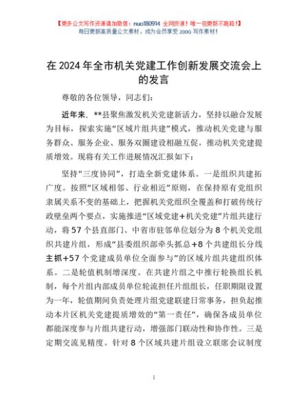 / 在2024年全市机关党建工作创新发展交流会上的发言