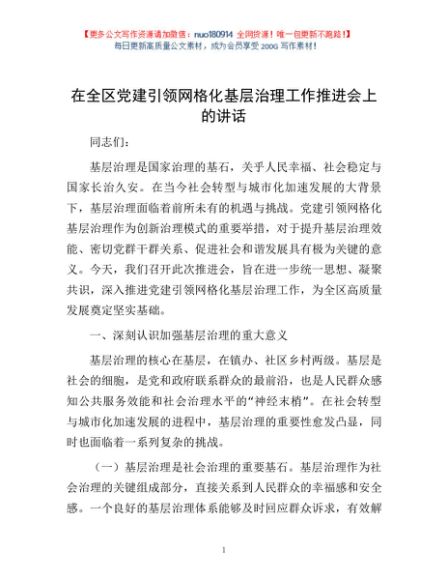 / 在全区党建引领网格化基层治理工作推进会上的讲话