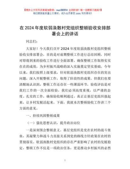 / 在2024年度软弱涣散村党组织整顿验收安排部署会上的讲话