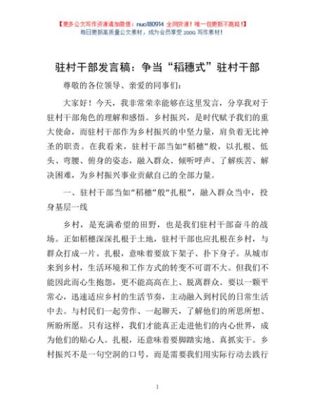 / 驻村干部发言稿:争当 “稻穗式” 驻村干部