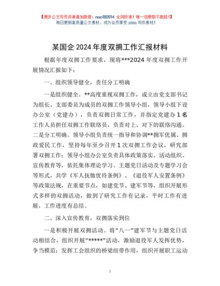 / 某国企2024年度双拥工作汇报材料