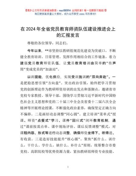 / 在2024年全省党员教育师资队伍建设推进会上的汇报发言