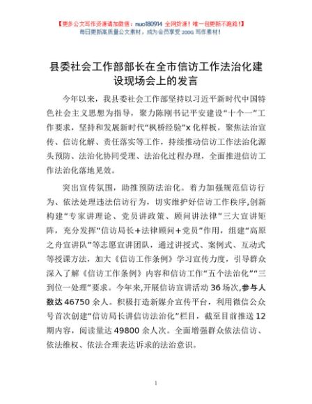 / 县委社会工作部部长在全市信访工作法治化建设现场会上的发言