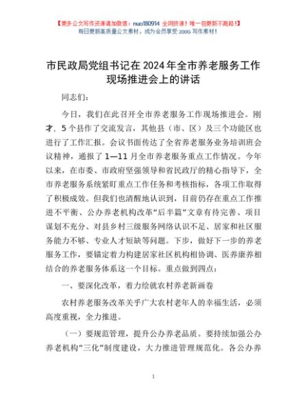/ 市民政局党组书记在2024年全市养老服务工作现场推进会上的讲话