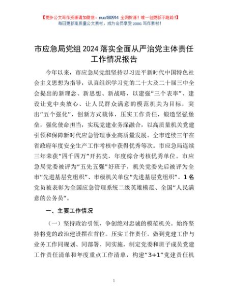 / 市应急局党组2024落实全面从严治党主体责任工作情况报告