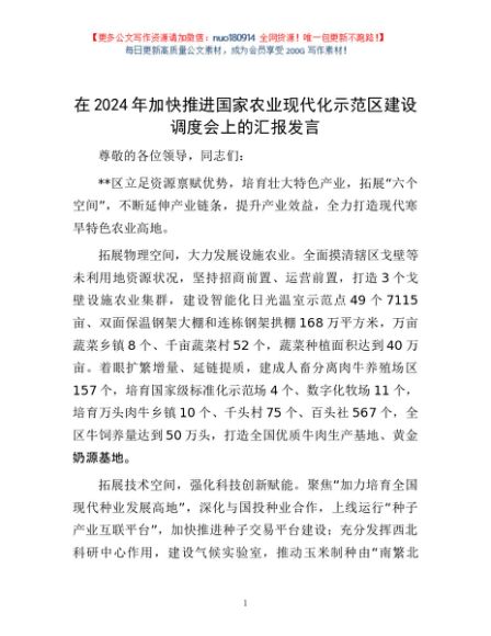 / 在2024年加快推进国家农业现代化示范区建设调度会上的汇报发言