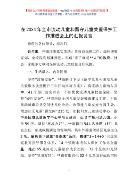 / 在2024年全市流动儿童和留守儿童关爱保护工作推进会上的汇报发言