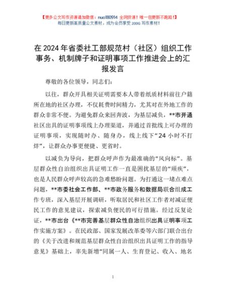 / 在2024年省委社工部规范村(社区)组织工作事务、机制牌子和证明事项工作推进会上的汇报发言